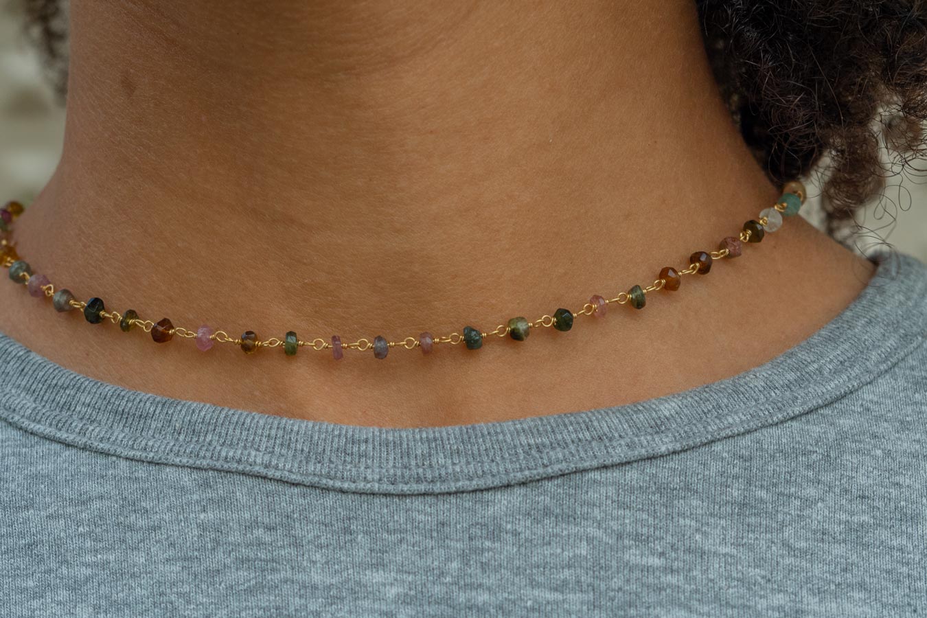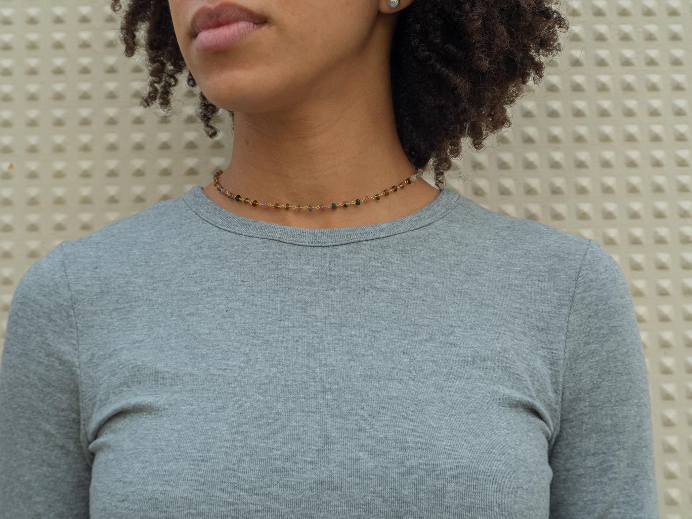 Delicado y vibrante, este collar de turmalina multicolor está tejido a mano con un fino trenzado de hilo. Una pieza ligera y llena de energía natural, diseñada para acompañarte cada día con un toque de color sutil y atemporal.