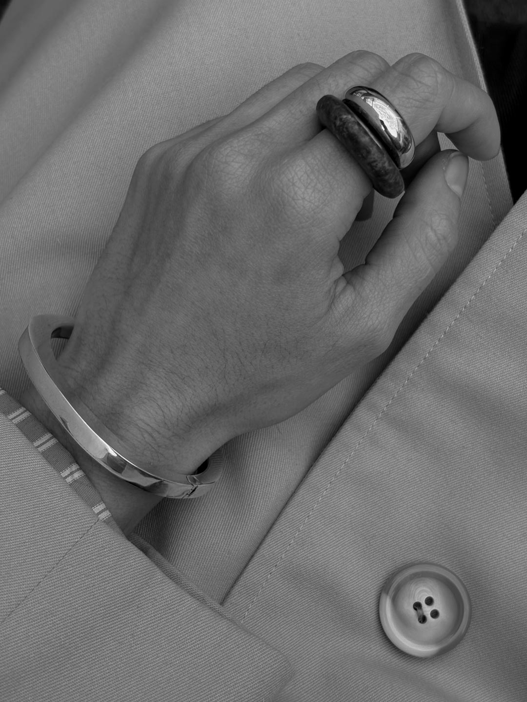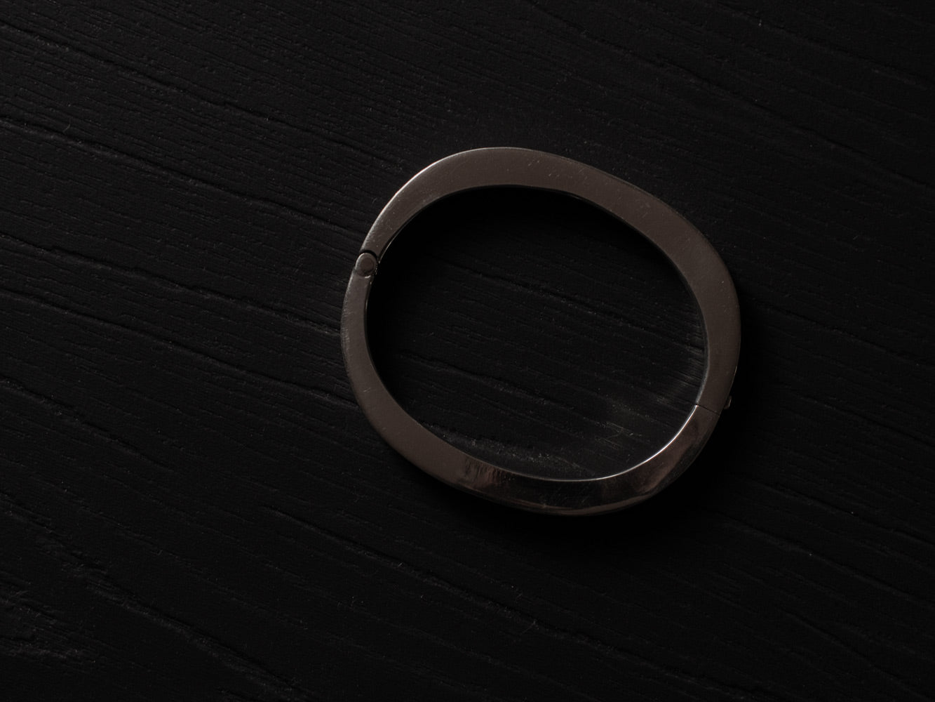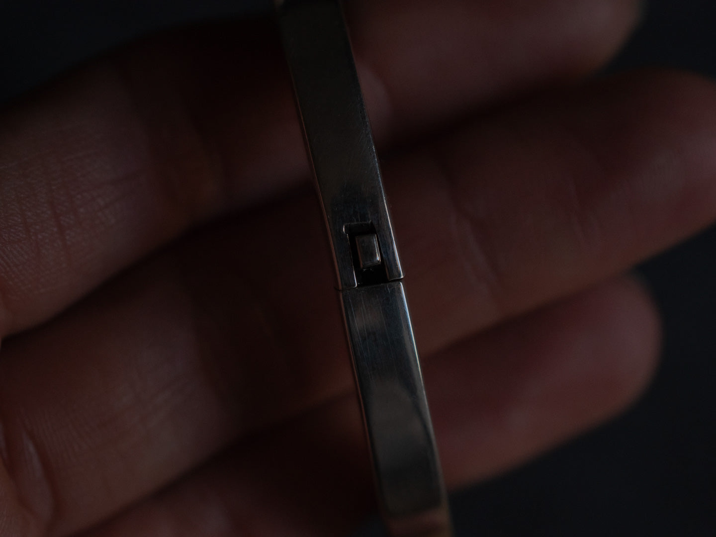 Esclava de plata esterlina hueca con silueta cuadrada suave y cierre box integrado. Una pieza vintage hecha a mano, sobria y elegante, creada para acompañarte a diario y elevar cualquier look.
