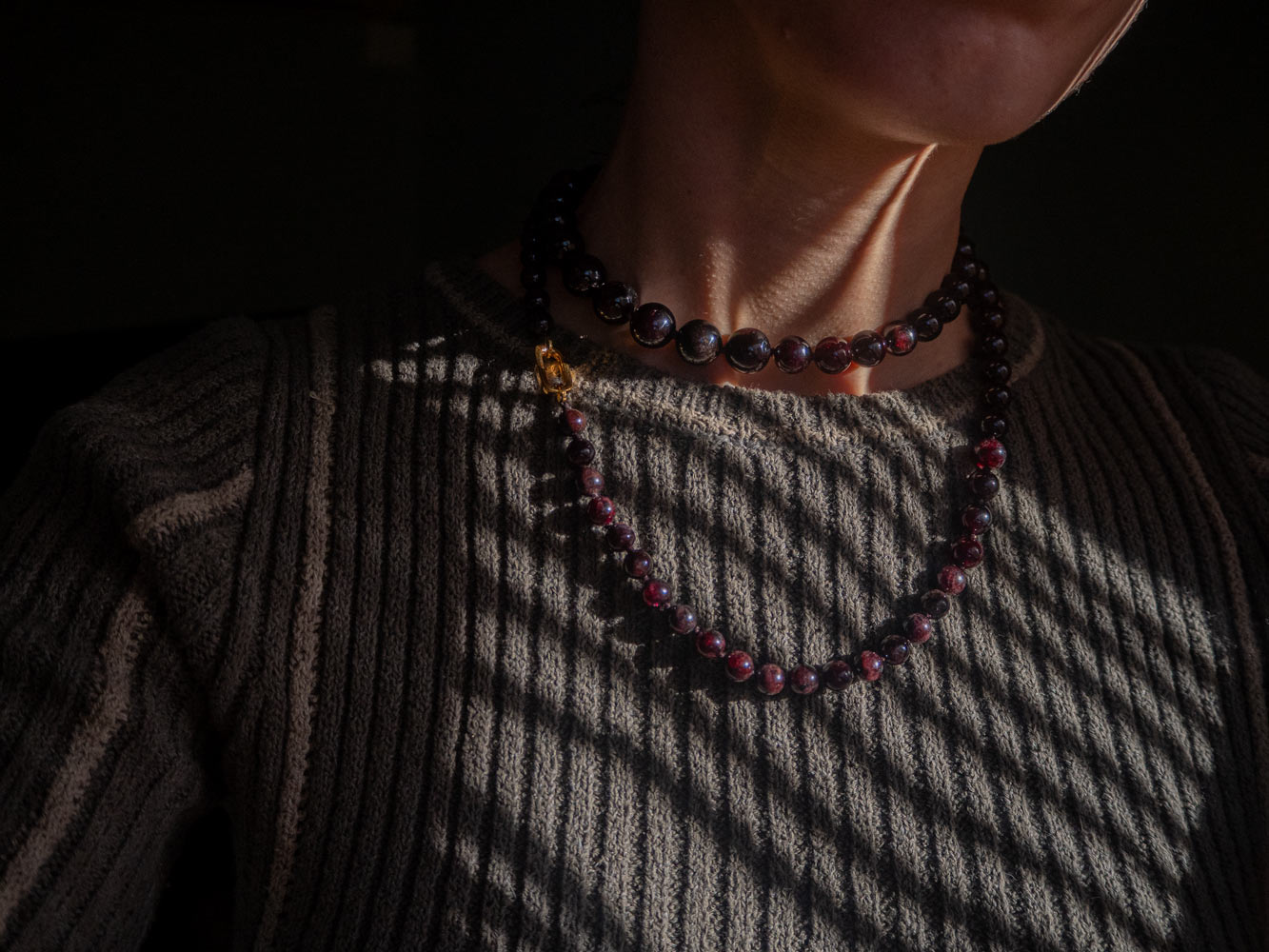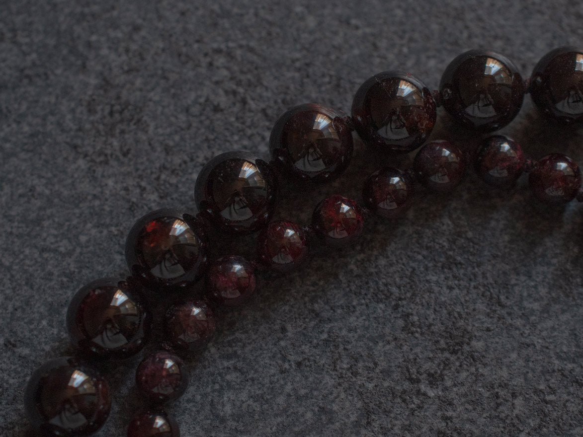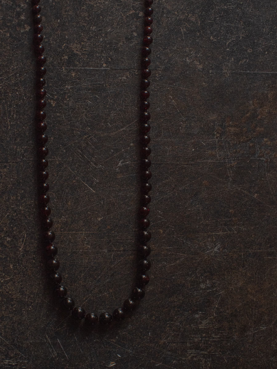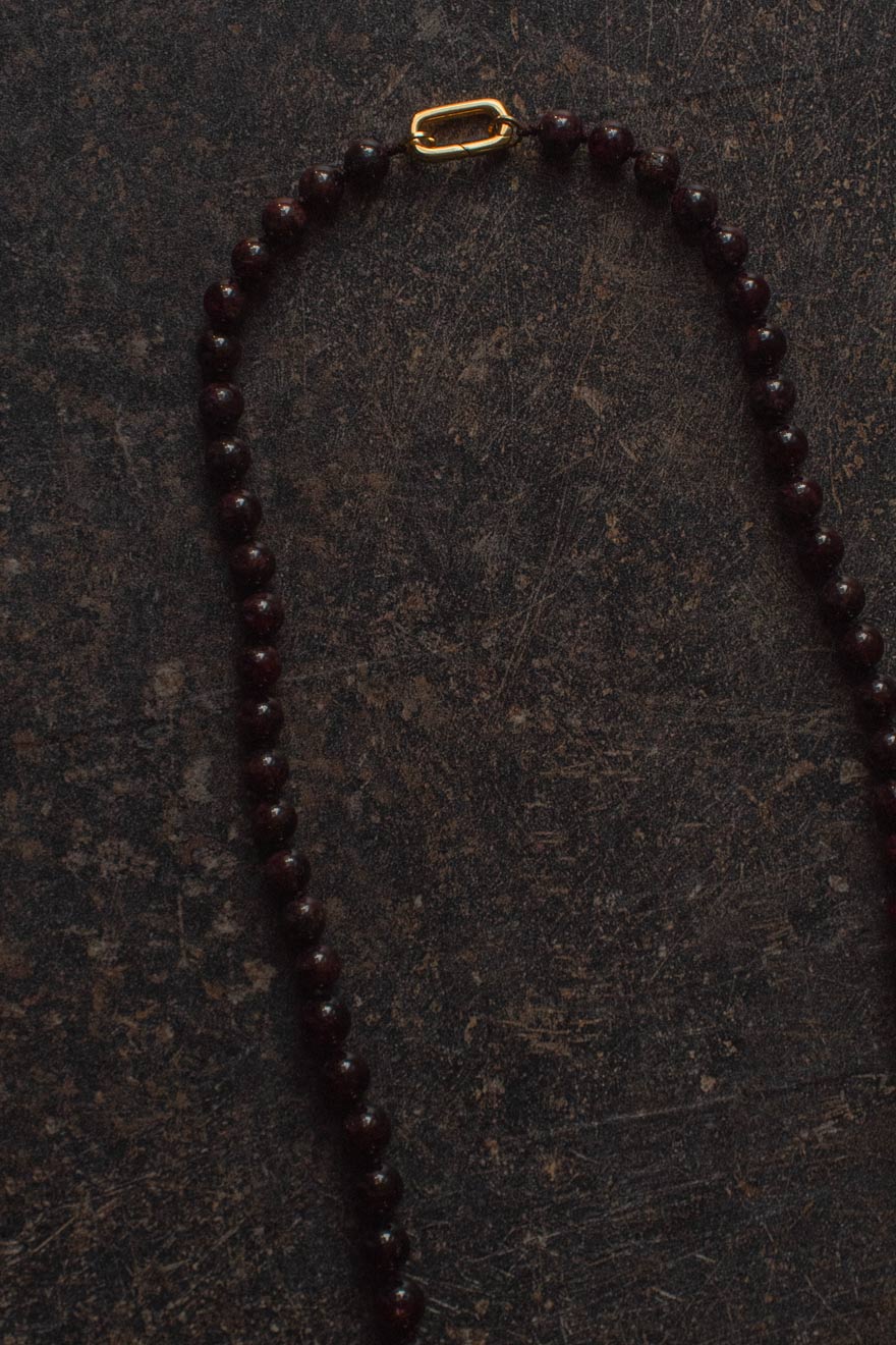 Collar largo de granate con cuentas de distintos tamaños, cuidadosamente ensartadas a mano y rematado con un cierre de mosqueton. Una pieza que eleva cualquier look, el diseño permite llevarlo en doble vuelta, transformándose en un accesorio versátil y sofisticado. Minimalismo con carácter, un toque de fuerza y elegancia en cada detalle.