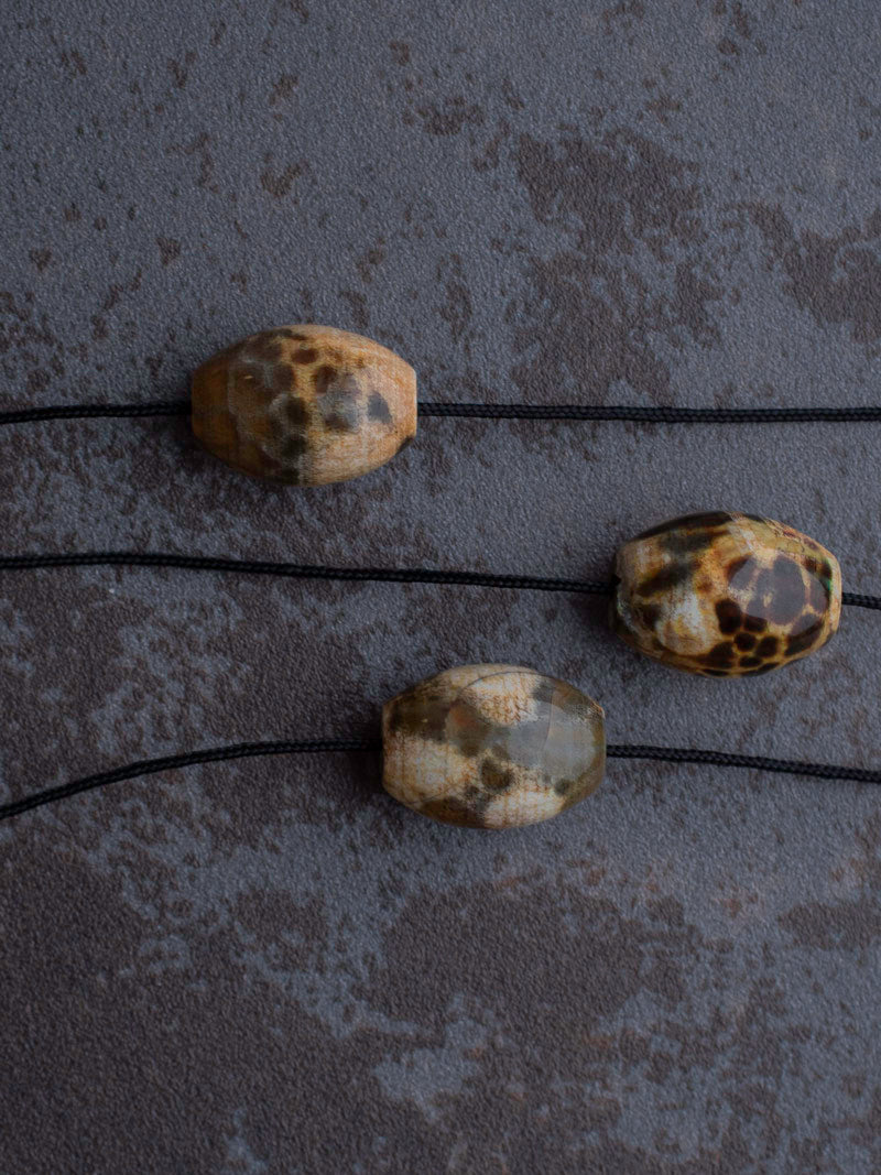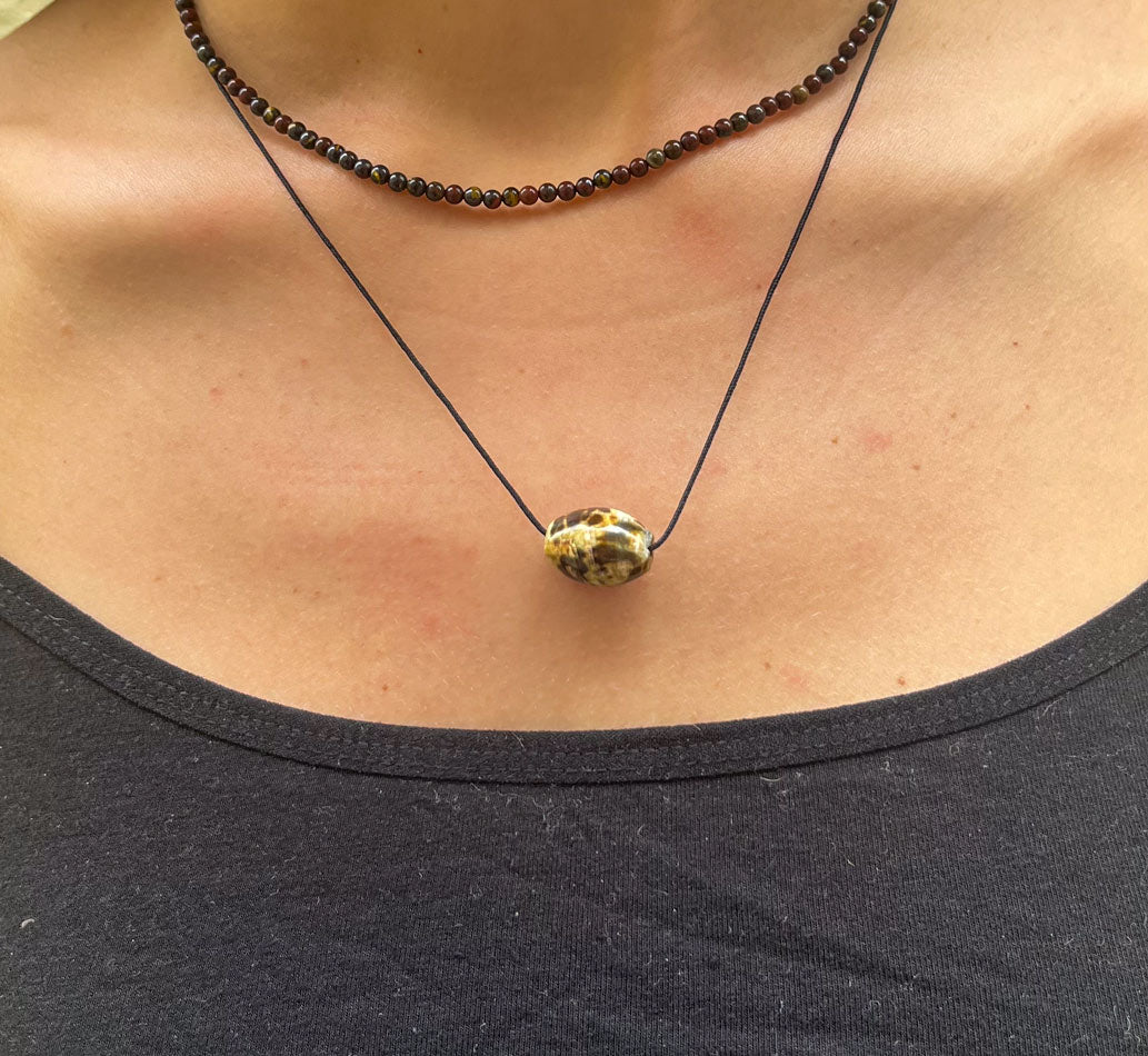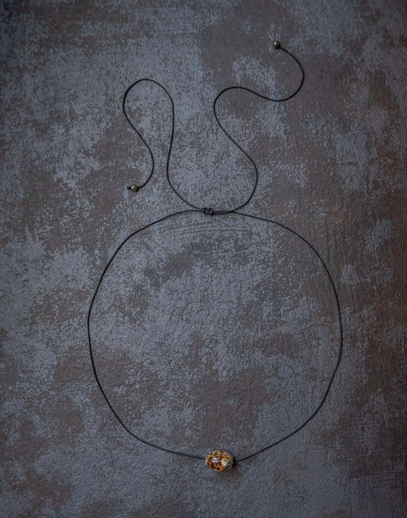 Colgante de Jaspe Leopardo ajustable que puede lucirse como collar o gargantilla. Su pieza central, un ovalado Jaspe Leopardo de intenso lustre, se acompaña de terminaciones en cuentas de pirita que aportan fuerza y equilibrio.