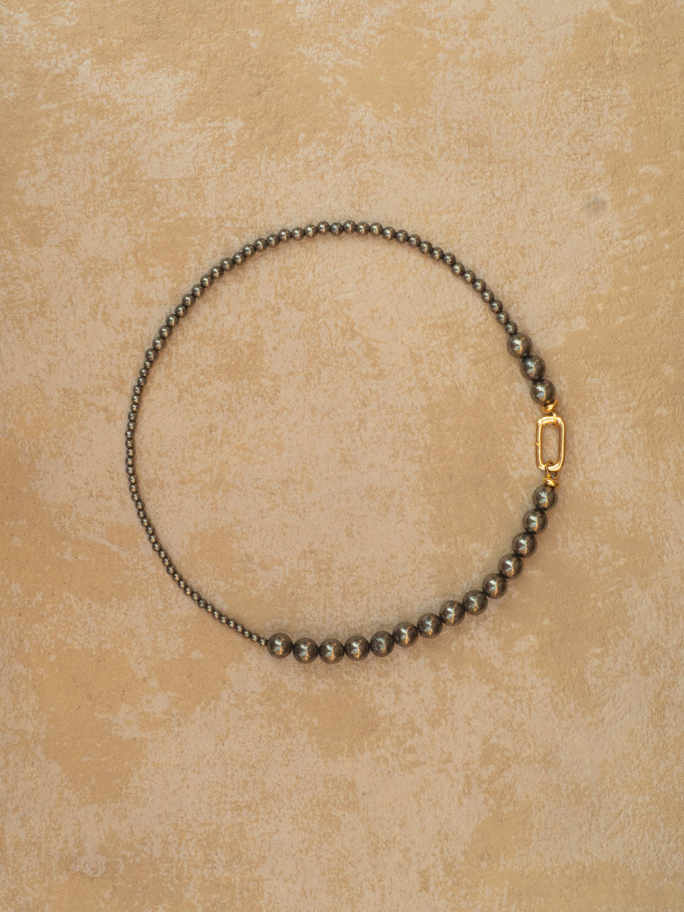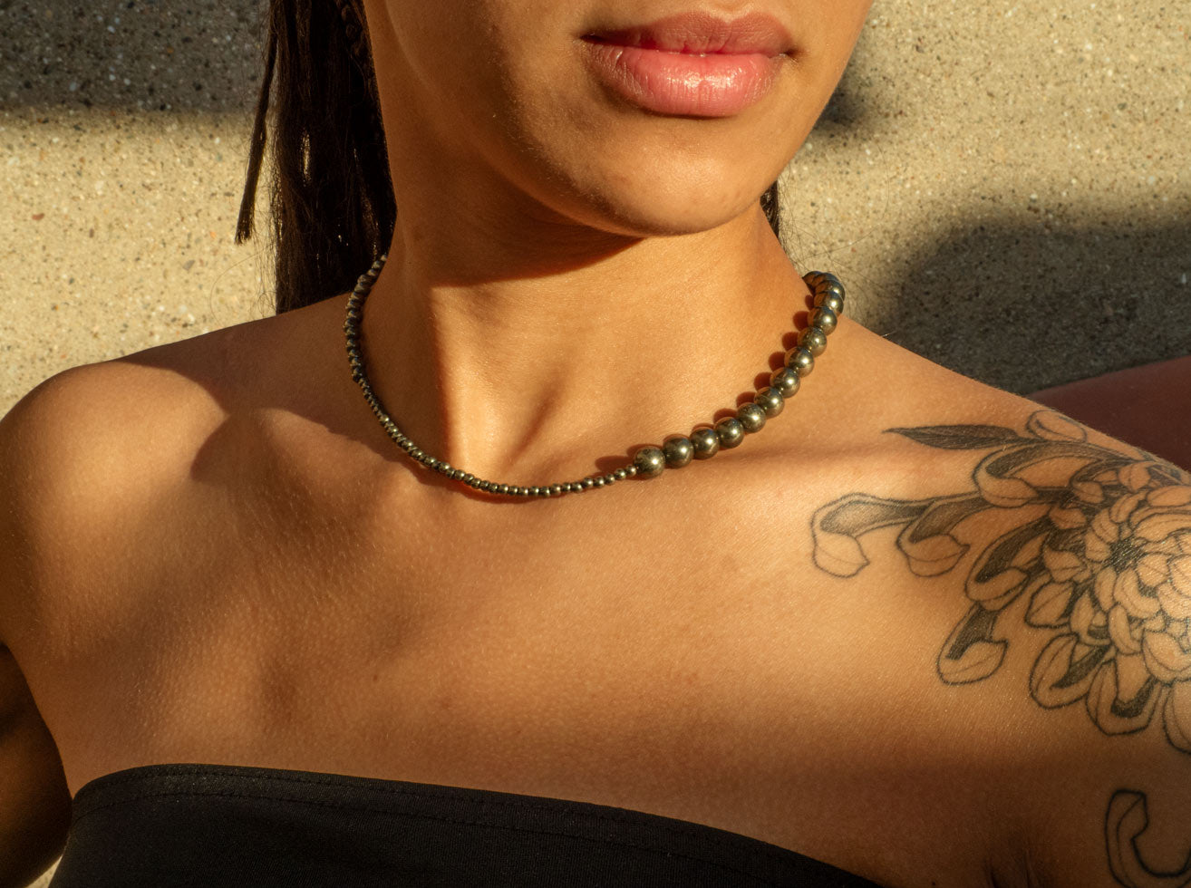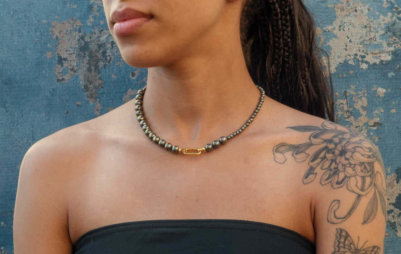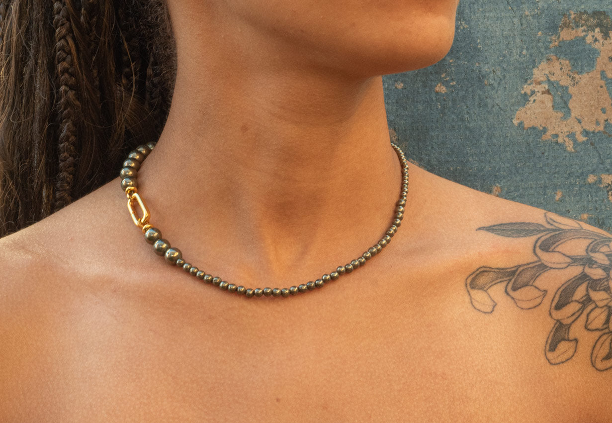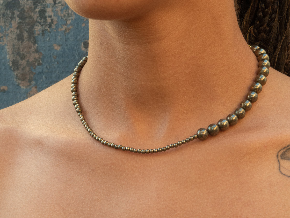 Collar con una variedad de cuentas de Pirita en un cordón de seda con cierre de baño de oro.