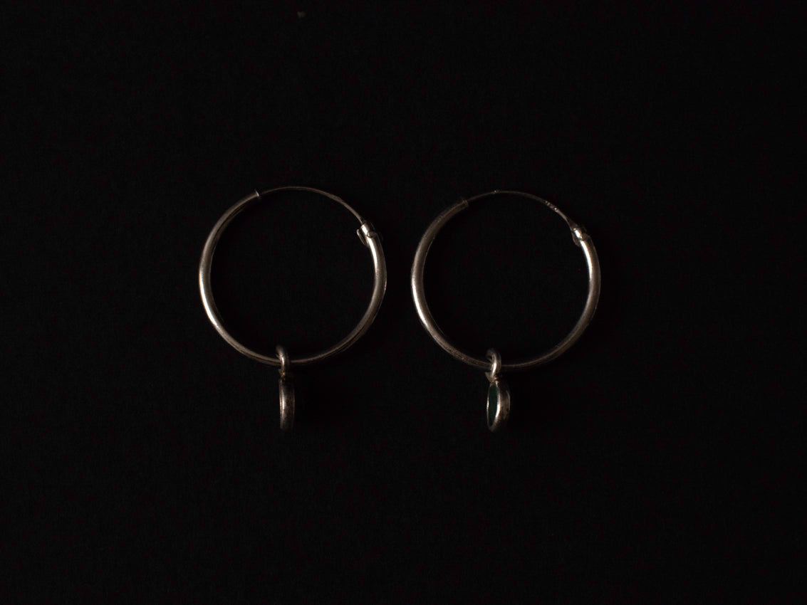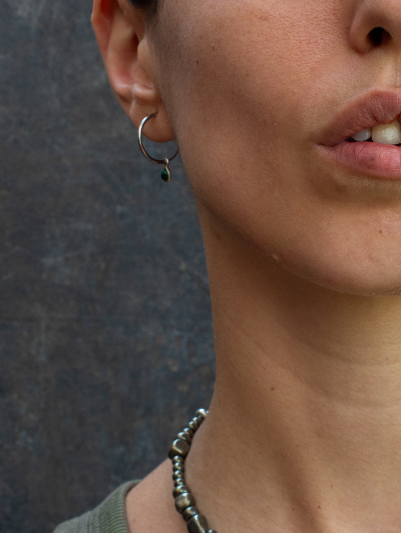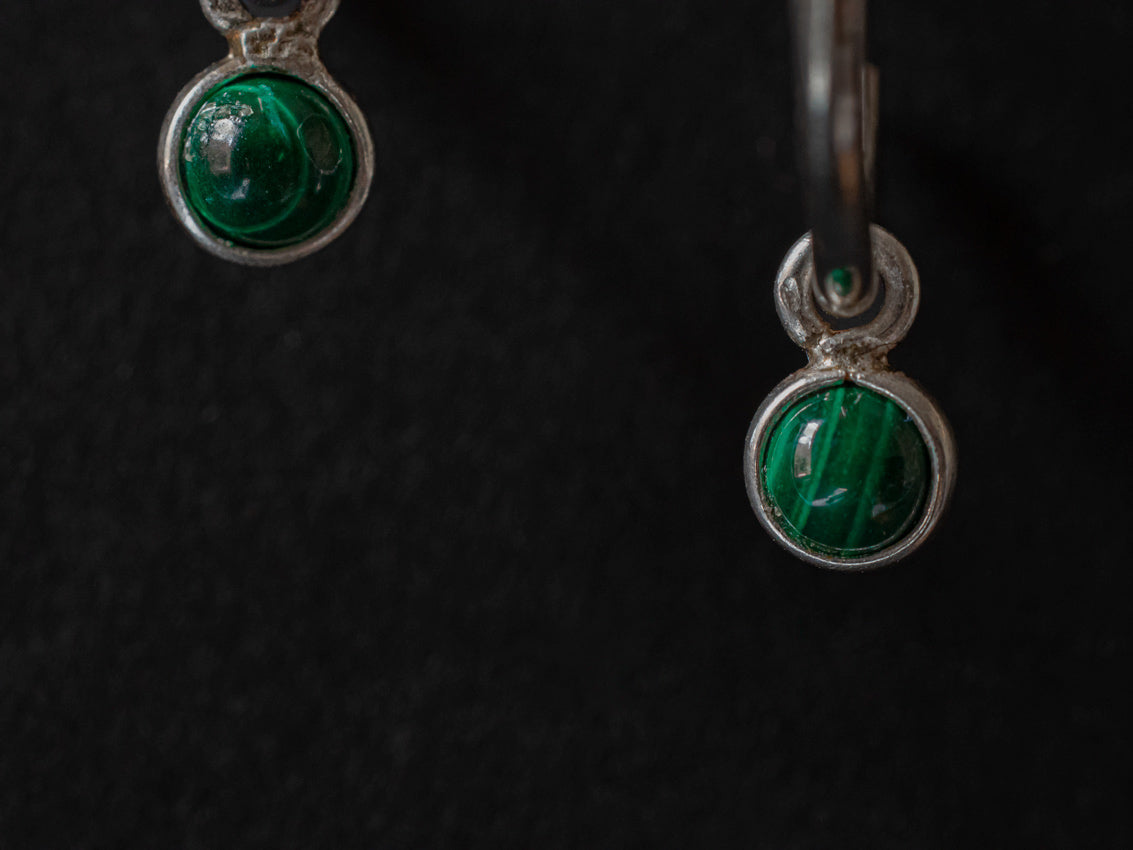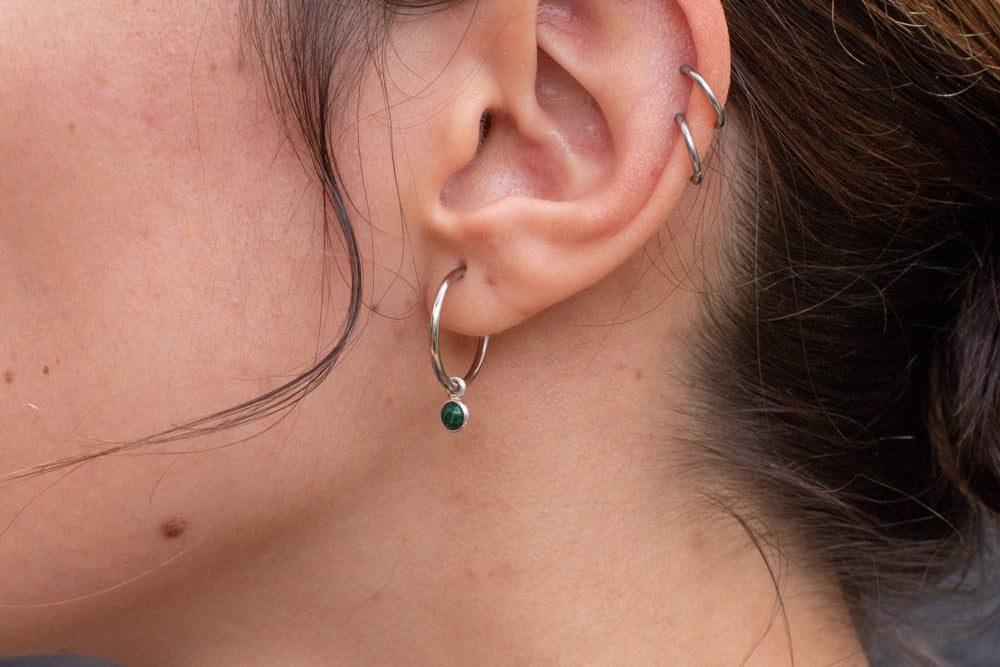 Pendientes de aros finos de plata con malaquita engastada en plata de ley.